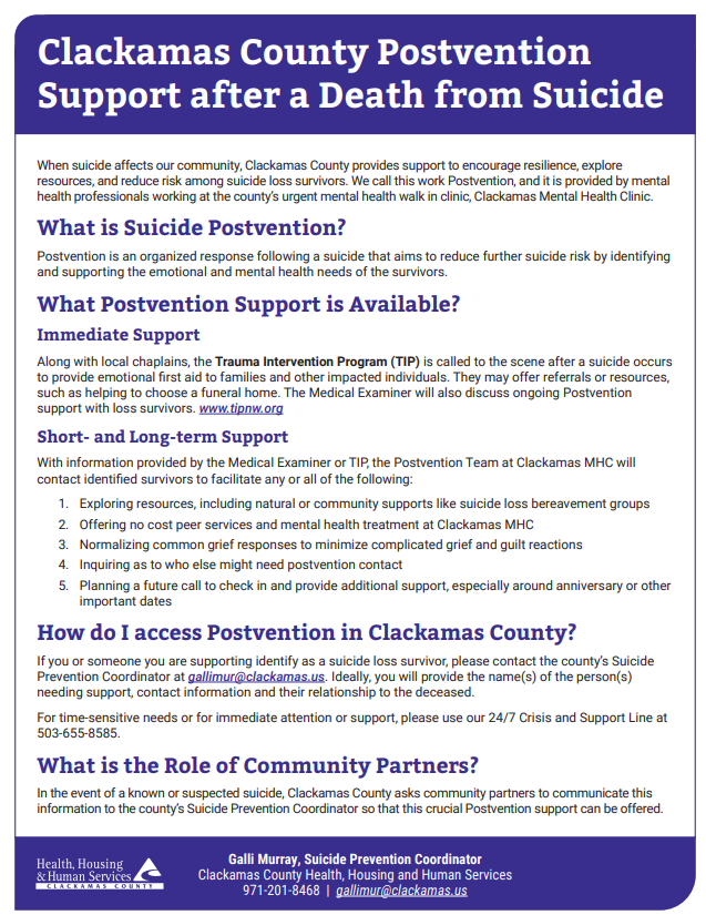 When suicide affects our community, Clackamas County provides support to encourage resilience, explore resources, and reduce risk among suicide loss survivors. We call this work Postvention, and it is provided by mental health professionals working at the county’s urgent mental health walk in clinic, Clackamas Mental Health Clinic.