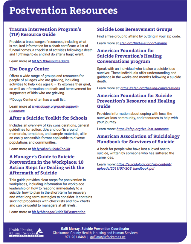 If you or someone you are supporting identify as a suicide loss survivor, please contact the County’s Suicide Prevention Coordinator at gallimur@clackamas.us. You may be asked to provide the name(s) of the person(s) needing support, contact information and their relationship to the deceased.